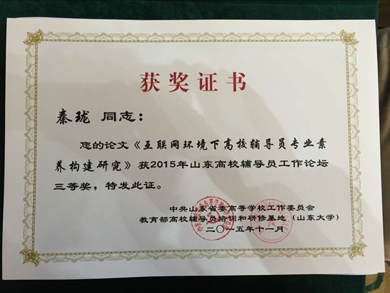 近日,省委高校工委发文《关于表彰2015年山东高校辅导员工作论坛获奖论文的决定》(鲁高工委〔2015〕31号),经学生工作处初选推荐,我院教师秦珑撰写的《互联网环境下高校辅导员专业素养构建研究》荣获三等奖。本次论坛共收到95所高校报送的论文275篇,共评出优秀论文108篇,其中一等奖20篇,二等奖36篇,三等奖52篇。