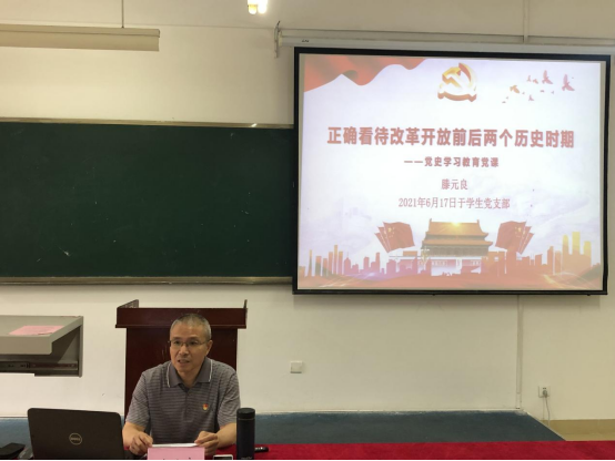 为推进党史学习教育走深走实,切实发挥好学生党员的引领表率作用,引导学生党员学党史、悟思想、办实事、开新局,6月17日下午6点,工商学院在博思楼208集中开展“正确看待改革开放前后两个历史时期”党史学习教育党课,此次党课由工商学院党总支书记滕元良主讲,工商学院学生党支部共计70余人参加。