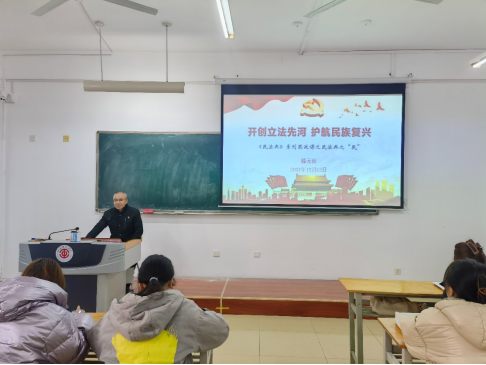 为更好将《民法典》融入大学生课堂,讲新讲活思政课,引导学生增强法治思维、法治意识,提升运用法律手段解决问题的能力,12月13日上午,工商学院党总支在博思楼204开展“开创立法先河 护航民族复兴”《民法典》系列思政课之民法典之“民”。本次思政课由党总支书记滕元良主讲,辅导员胡玥主持,2020级市场营销校企班40余人参加。