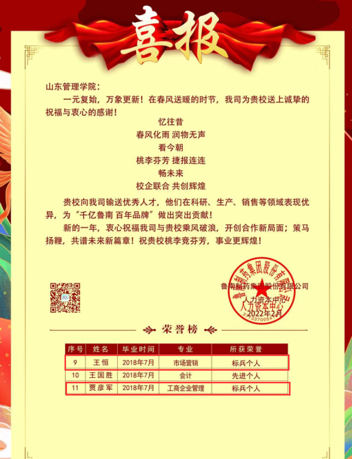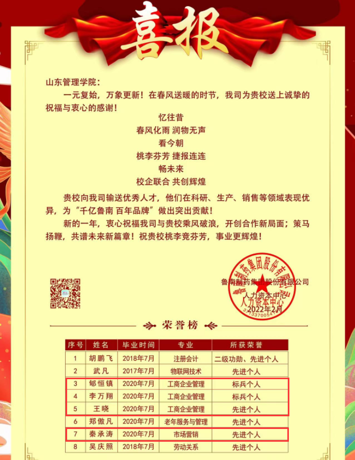 2月21日,学校收到鲁南制药集团传来的喜报。其中,工商学院李万翔等6名毕业生因工作努力、表现突出,获得该企业“先进个人”、“标兵个人”等荣誉称号。