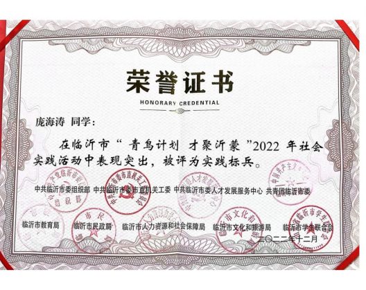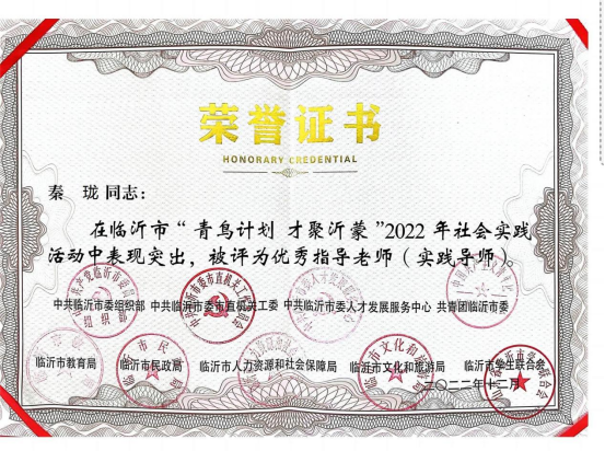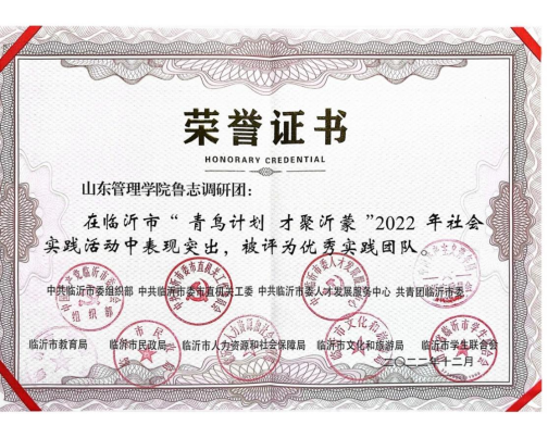 经过团队成员的不懈地努力,将实践资料和实践经历转化成实践成果,向社会各界展示了属于鲁志调研团的风采!最终,鲁志调研团获评临沂市“青鸟计划,才聚临沂”优秀实践团队,庞海涛同学获评临沂市“青鸟计划,才聚临沂”优秀实践标兵,秦珑老师获评临沂市“青鸟计划,才聚临沂”优秀指导老师。