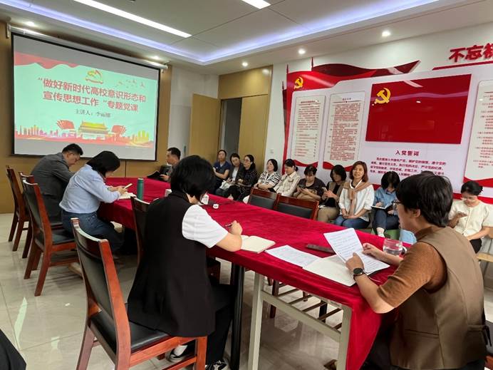 李丽娜传达了学校2023年意识形态和宣传思想工作领导小组会议精神。深入阐释了习近平总书记关于意识形态工作的重要论述,讲解了高校意识形态建设的重要性。同时,结合国内高校意识形态和宣传思想领域的典型案例,系统分析了当前高校面临的形势以及存在的薄弱环节,并就如何坚持守正创新,高质量做好新时代意识形态和宣传思想工作作出全面部署。