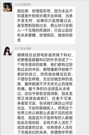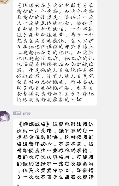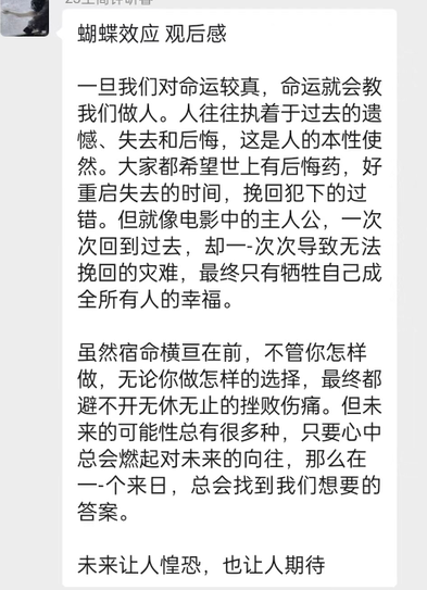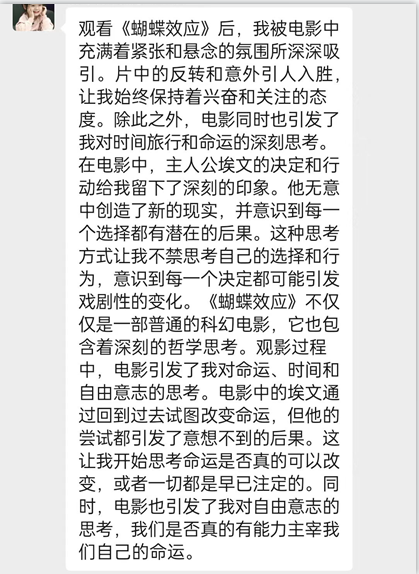 在观看《蝴蝶效应》后,同学们理解到了“蝴蝶效应”背后的奥秘——不起眼的一个小动作,却能引起一连串的巨大反应。五次改变,五次重置人生,引发不同结局的故事。把原本宏大的科学猜想,通过个人的故事,来表达人类在这样的科学猜想面前,该会做什么抉择,从心理学角度切入,让同学们对人生哲理展开思考。