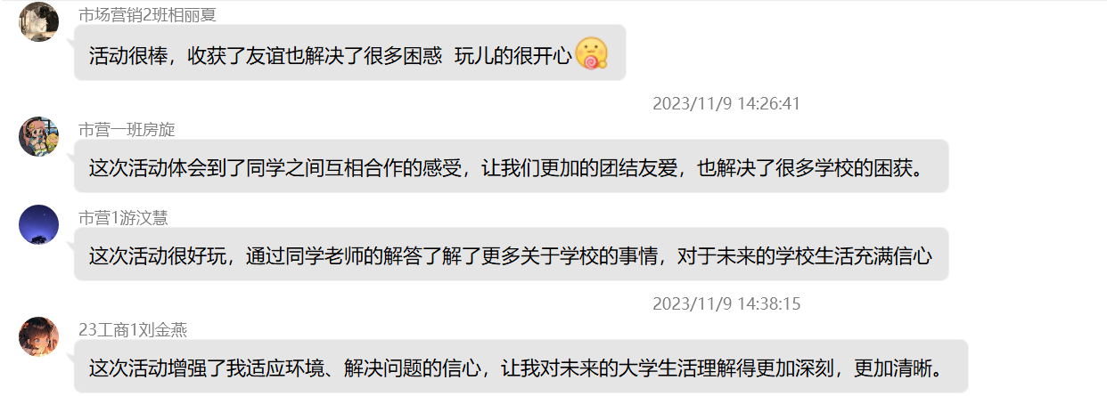 本次活动的开展,让组员充分体会团队合作的重要性,增强了彼此间的信任,为组员提供了适应新环境的途径与方式,有利于以更饱满的热情和自信投入到今后的大学生活。