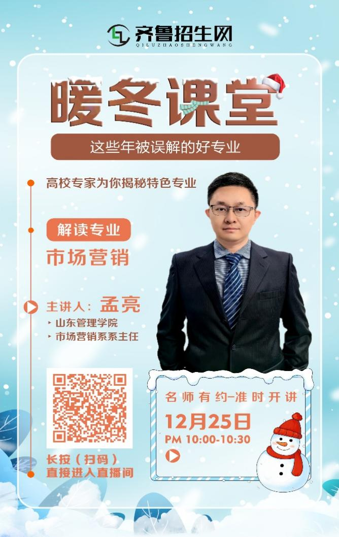 为有效解读市场营销专业特色、扩大工商学院市场营销专业影响力,切实提升本科生源质量,完善学位点招生宣传工作。2023年12月25日上午,市场营销专业携手齐鲁招生网开展“暖冬课堂”线上专业特色宣讲会。