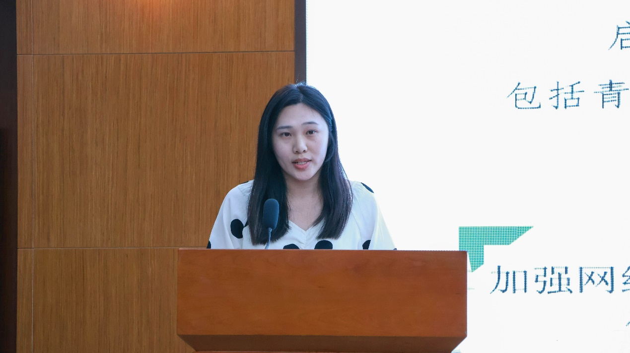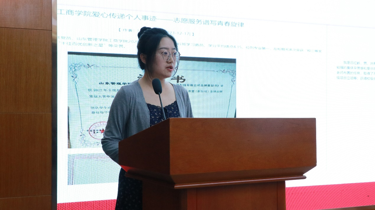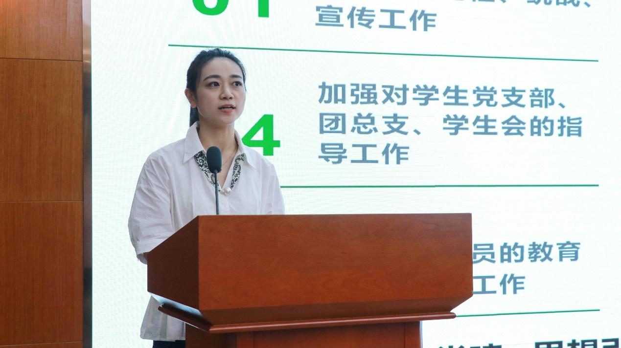 胡玥围绕“党建 +”创新工作模式,汇报学院学生党建工作。她以“商青先锋” 党建品牌为核心,系统梳理了近年来学院学生党建工作的规划布局与实施路径,展示了在品牌引领下取得的丰硕成果。同时,为进一步推动党建与团建深度融合,胡玥还对下一步工作方向进行了规划与展望,为持续深化学生党建工作注入新动能。