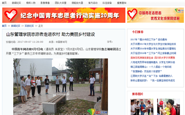 9月7日,中国青年网发表题为《山东管理学院志愿者走进农村 助力美丽乡村建设》的新闻,对此次活动进行了详细报道。下一步,将通过清华大学中国农村研究院,把本次活动所掌握的问题及建议报送到中国农村工作领导小组、农业部等有关部门,为有关部委制定“三农”政策提供参考依据。