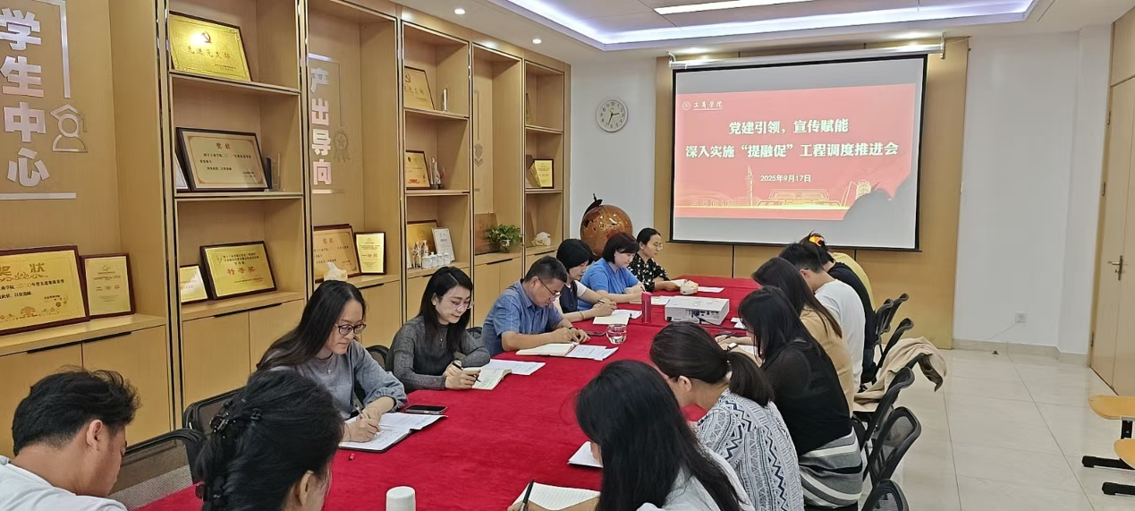 9月17日下午,工商学院党委在博思楼211会议室组织召开“党建引领,宣传赋能,深入实施‘提融促’工程调度推进会”,全面回顾2025年上半年工作成效,并就下半年党建与宣传工作的总体要求与重点任务作出部署。会议由学院党委书记胡忠任主持。学院领导班子成员、党支部书记、副书记、科级干部等参加会议。