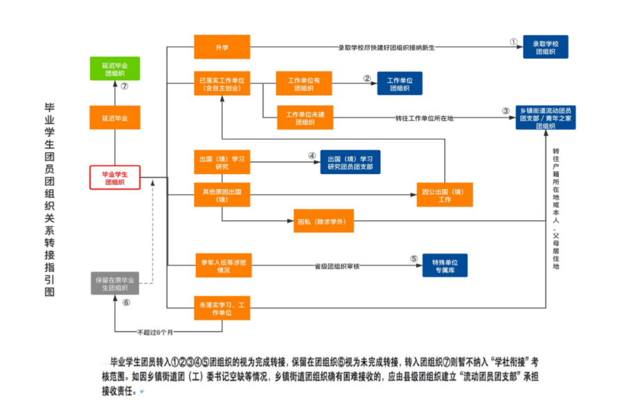 (6)出国(境)工作的毕业学生团员:因公出国(境)的毕业学生团员,在出国(境)前将其团组织关系转至派出单位的团组织。因私出国(境)的毕业学生团员(求学除外),在出国(境)前将其团组织关系转接至户籍所在地或本人、父母居住地的乡镇街道团组织