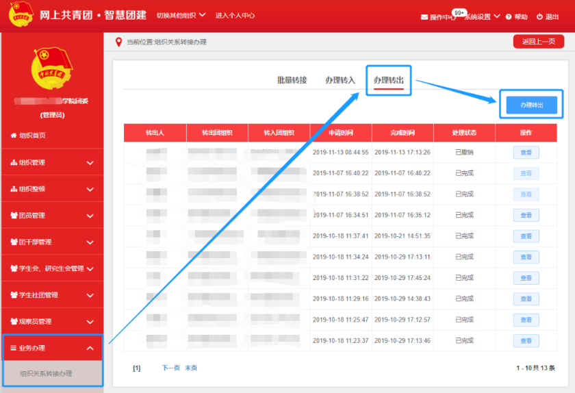 系统网址https://zhtj.youth.cn/zhtj/signin,进入后点击左侧功能栏中“业务办理”,选择“组织关系转接办理”,选择“办理转出”,进入操作页面。