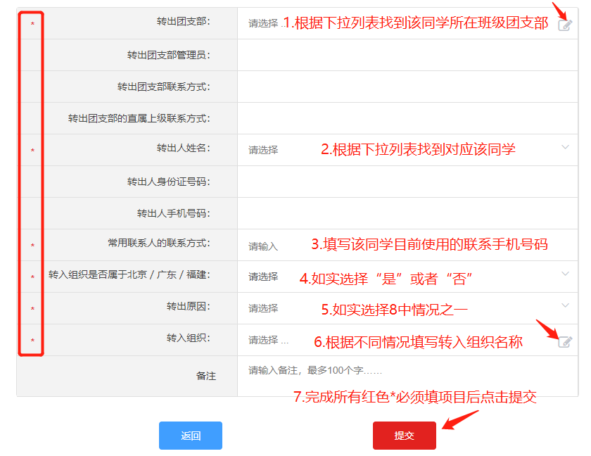 ●出国(因私出国/境):选择转出团支部、转出人姓名、转入组织是否属于北京/广东/福建、转出原因[出国(因私出国/境)]、填写户籍地或居住地详细地址、转入组织。