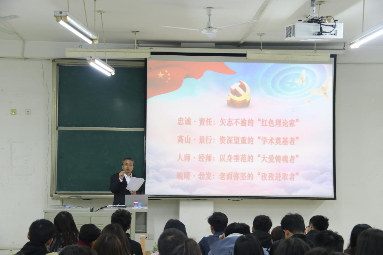 党课上,滕元良书记详细的介绍了本次讲解的榜样—郑德荣教授,主要从四个方面介绍了郑德荣教授的生平事迹和各种成就。第一方面,忠诚·责任:矢志不渝的“红色理论家”;第二方面,高山·景行:资深望重的“学术奠基者”;第三方面,人师·经师:以身垂范的“大爱铸魂者”;第四方面,晚晴·勃发:老而弥坚的“孜孜进取者”。滕元良书记通过对郑德荣教授四个方面的介绍及讲解,强调了郑德荣教授对中共党史和毛泽东思想研究做出的突出贡献。要求同学们向教授学习,也要认真学习党史党章。