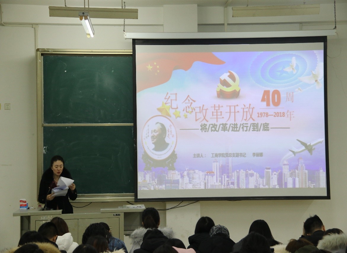 12月27日下午四点,工商学院开展了“纪念改革开放四十周年——将革命进行到底”的专题党课活动,工商学院党总支副书记李丽娜老师就改革开放四十周年的重大意义进行了深切演讲。