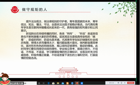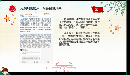 此次党课张秋静老师结合疫情期间发生的真实案例,为同学们讲述了规则的重要性。规则是人们日常生活中必须遵守的规范和准则,它保证人们生活、学习、工作的有序进行,规则是保护社会的铠甲,也是每一个人的保护伞,每个人都应该具备规则意识。