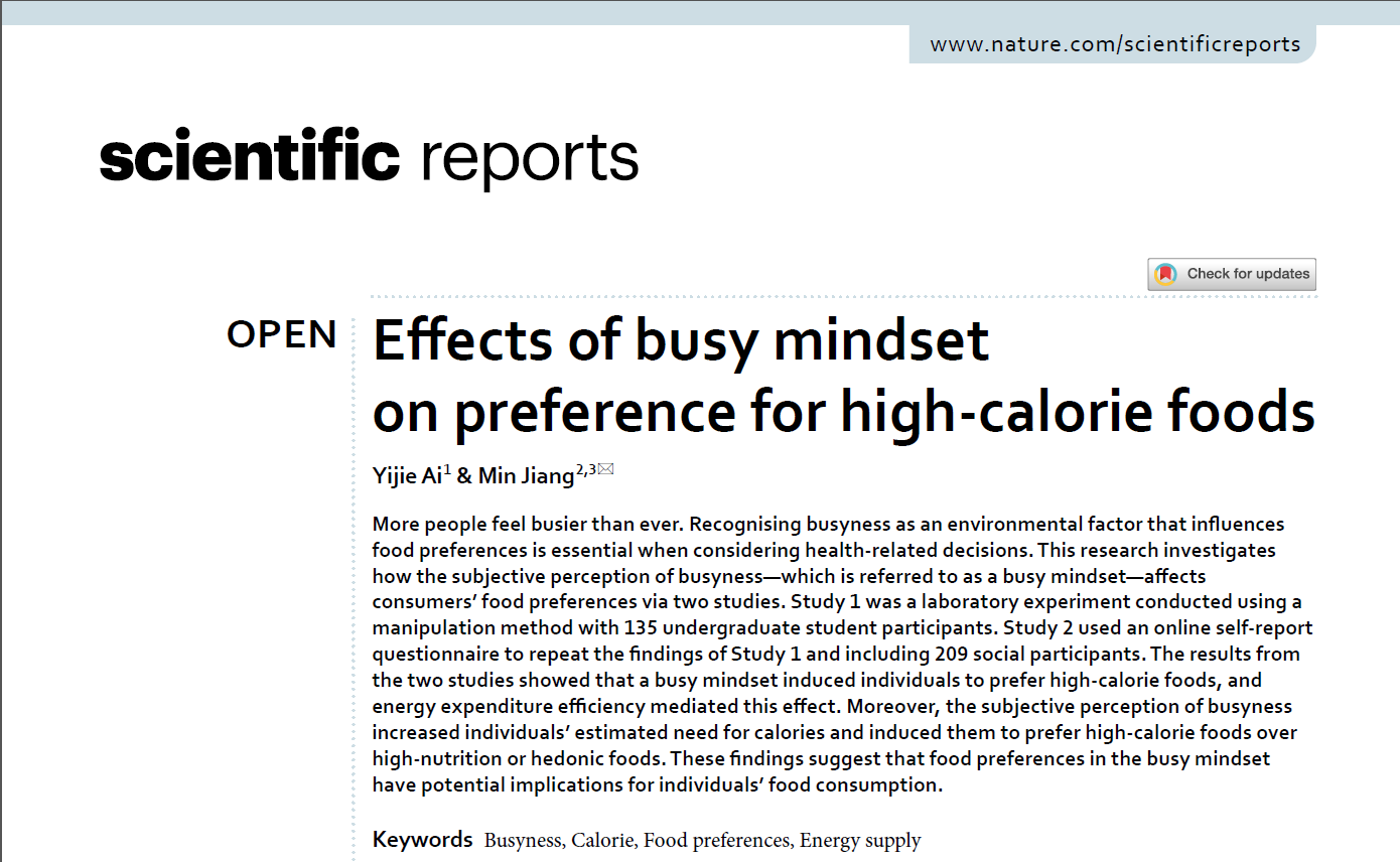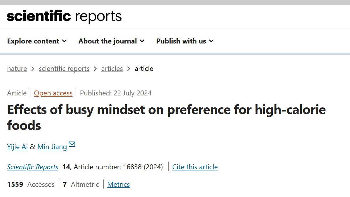 近日,《Scientific Reports》期刊(中科院二区)发表了我院教师艾义洁博士团队的研究成果《Effects of busy mindset on preference for high-calorie foods》,艾义洁为该论文的第一作者。