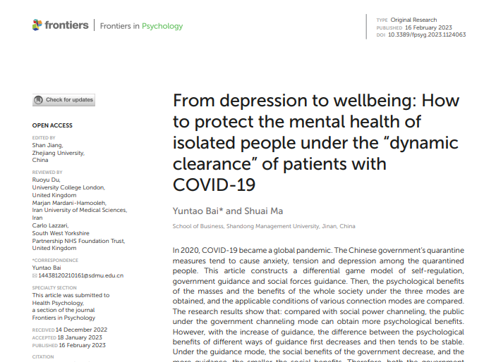 近日,我校教师白云涛博士及其合作者撰写的论文《From depression to wellbeing: How to protect the mental health of isolated people under the “dynamic clearance” of patients with COVID-19》在国外期刊《Frontiers in psychology》发表,白云涛博士为该论文第一作者和通讯作者,该论文为SSCI JCR一区.