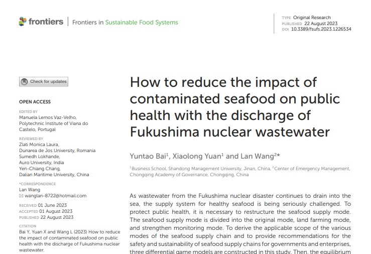 近日,我校教师白云涛博士及其合作者撰写的论文《How to reduce the impact of contaminated seafood on public health with the discharge of Fukushima nuclear wastewater》在国外管理学期刊《Frontiers in sustainable food system》发表,白云涛博士为该论文第一作者,该论文为SCI 中科院二区.
