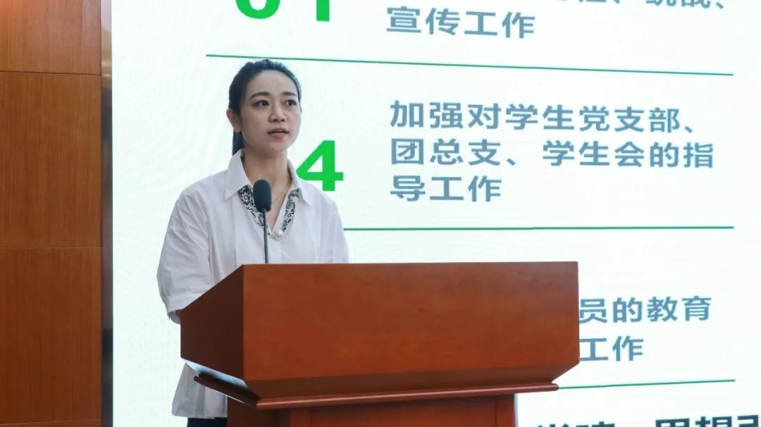 胡玥围绕 “党建 +”创新工作模式,汇报学院学生党建工作。她以“商青先锋” 党建品牌为核心,系统梳理了近年来学院学生党建工作的规划布局与实施路径,展示了在品牌引领下取得的丰硕成果。同时,为进一步推动党建与团建深度融合,胡玥还对下一步工作方向进行了规划与展望,为持续深化学生党建工作注入新动能。
