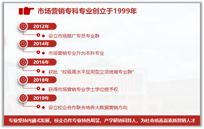 市场营销专业自1999年开始专科招生,2014年设立市场营销本科专业,2015年设立网络营销方向,2016年获批“校级高水平应用型立项培育专业群”;2018年获得市场营销专业学士学位授予权,并获省级教学成果一等奖。2019年开设校企合作专业数字化营销方向。2020年《市场营销专业创新创业实践》获国家一流本科课程,2022年获批山东省一流本科专业。目前在校学生约500人,近五年的就业率均在90%以上。